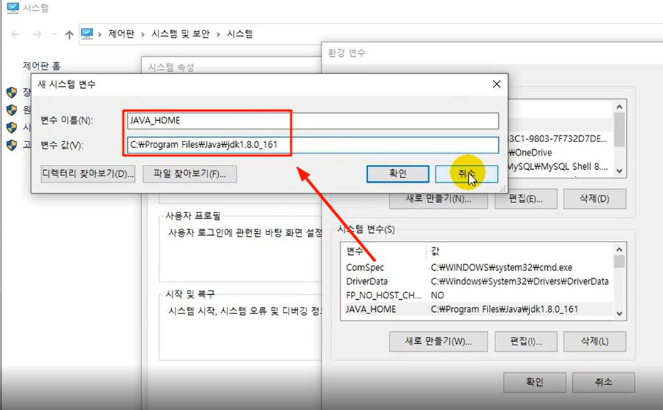 제어판 -> 시스템 및 보안 -> 시스템 -> 고급시스템 설정 -> 환경 변수 -> 시스템 변수(S)