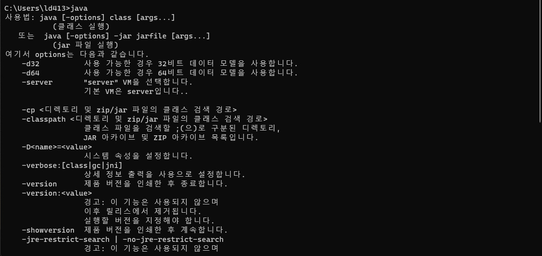 자바가 정상적으로 설치되었는지, cmd를 이용해 실행환경과 자바버전 을 확인한다.