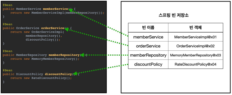 - 스프링 컨테이너는 파라미터로 넘어온 설정 클래스 정보를 사용해서 스프링 빈을 등록한다.