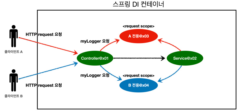 - @Scope(value = "request") 를 사용해서 request 스코프로 지정했다. 이제 이 빈은 HTTP 요청 당 하나씩 생성되고, HTTP 요청이 끝나는 시점에 소멸된다.