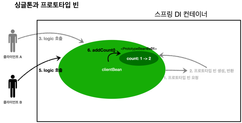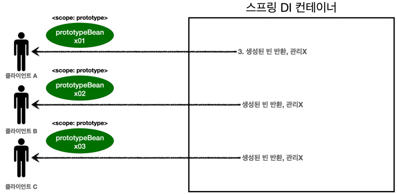 - 스프링 컨테이너는 생성한 프로토타입 빈을 클라이언트에 반환한다.