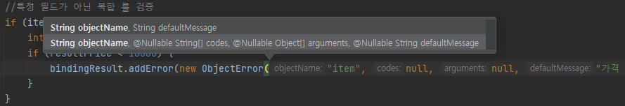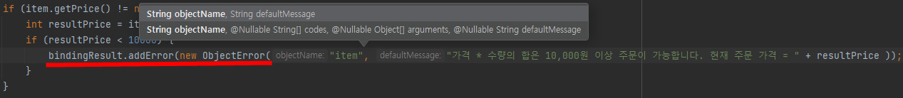 bindingResult.addError(new ObjectError("item", "가격 * 수량의 합은 10,000원 이상 주문이 가능합니다. 현재 주문 가격 = " + resultPrice ));