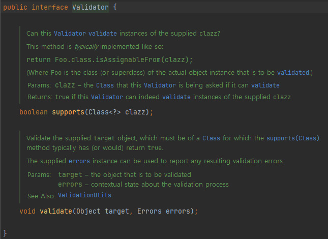 스프링에서는 검증을 체계적으로 수행할 수 있게 'Validator' 인터페이스를 제공한다. 이 인터페이스에는 두 가지 주요 메서드가 존재한다.
