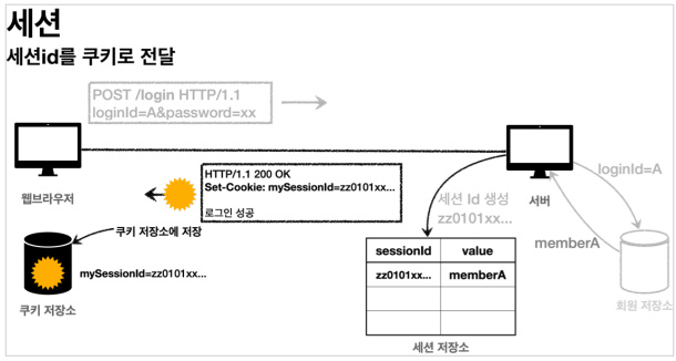 - 생성된 세션 ID와 함께 필요한 사용자 정보(memberA)를 서버의 세션 저장소에 보관한다.