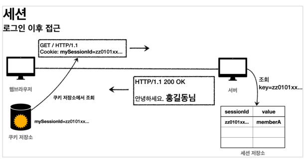 - 서버는 이 쿠키를 통해 세션 저장소를 조회하고, 해당 세션 ID에 연결된 사용자 정보를 찾아서 사용한다.
