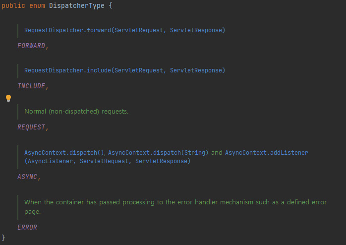 이렇게 두 가지를 모두 넣으면 클라이언트 요청은 물론, 오류 페이지 요청에서도 필터가 호출된다. 아무것도 넣지 않으면 기본 값이 DispatcherType.REQUEST 이다. 즉, 클라이언트의 요청이 있는 경우에만 필터가 적용된다. 반대로 오류 페이지 요청 전용 필터를 적용하고 싶으면 DispatcherType.Error 만 지정하면 된다.