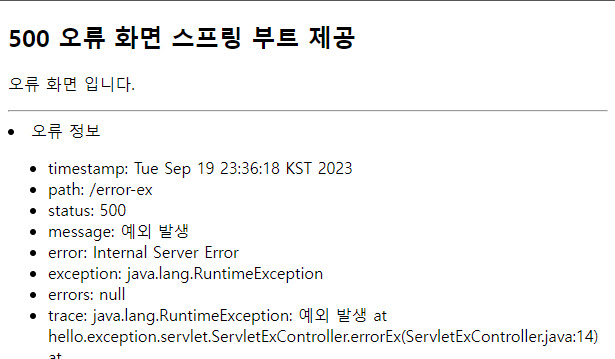 이렇게 설정하면, 스프링 부트의 기본 오류 페이지 기능이 꺼지게 되어 순수 서블릿 컨테이너의 예외 처리 방식을 볼 수 있다.