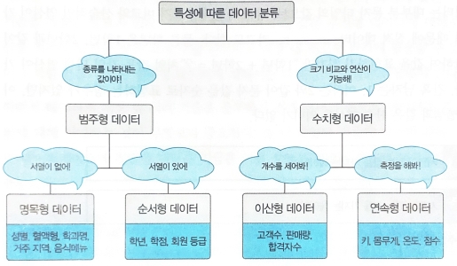 - 수치형 데이터 : 크기 비교와 산술적인 연산이 가능한 숫자 값을 가진 데이터
