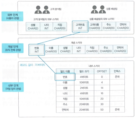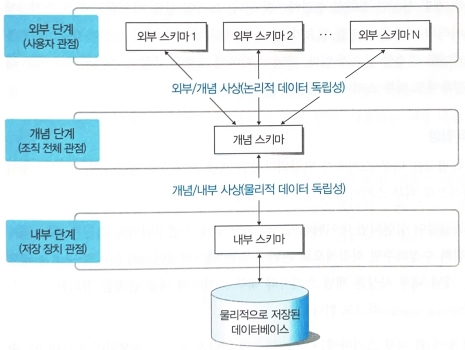 - 외부 단계 : 데이터베이스를 개별 사용자 관점에서 이해하고 표현한다. 사용자에게 필요한 데이터베이스를 정의한 외부 스키마가 여러개 존재할 수 있다.