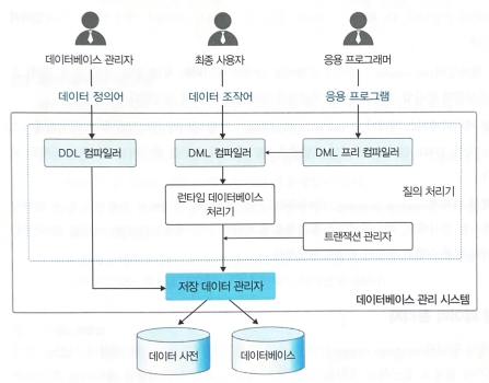 데이터베이스를 관리하고 사용자의 데이터 처리 요구를 수행하는 데이터베이스 관리 시스템은 데이터베이스 시스템의 주요 구성요소다. 사용자와 데이터베이스 사이에 위치하며, 기능에 따라 크게 질의 처리기와 저장 데이터 관리자로 구분할 수 있다.