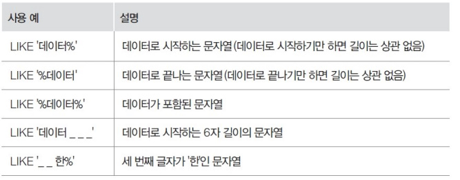 - 단, LIKE 키워드는 문자열을 이용하는 조건에만 사용할 수 있다.